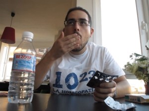 El suicidio en sí, que grabé en video (podéis ver algunas capturas que acompañan el texto; subiré el video en cuanto consiga editarlo), consistió en ingerir una caja entera, 40 pastillas —38 en realidad: una se la di a probar a un amigo, y la restante me la guardé para intentar suicidarme con ella de otra manera, pero ya llegaremos a eso— de Sedatif PC. Este sedante homeopático contiene, por el «módico» precio de algo más de 7 € la caja, caléndula officinalis, viburnum opulus y chelidonium majus (ambas tóxicas en altas dosis), pero también los potentes venenos abrus precatorius (una planta con una toxina tan nociva que bastan 3 millonésimas de gramo para matarte), aconitum napellus (que tiene aconitina; un miligramo es letal), y atropa belladona (veneno clásico). Todos ellos en igual cantidad, en disolución 6CH. Eso equivale, más o menos, a una gota de veneno (y de caléndula, etc.) por cada 20 piscinas olímpicas de agua. El resto es sacarosa (225mg) y lactosa (72mg) por pastilla. Ahí es nada.
