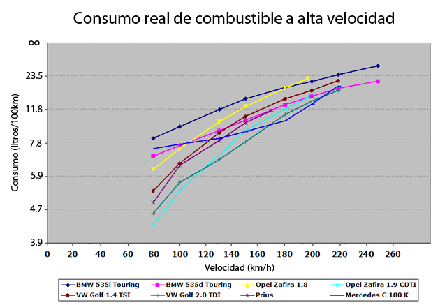 La última, en cambio, merece una mención aparte. Los motores de explosión (gasolina y gasoil) no ofrecen la misma potencia a las mismas revoluciones. Cada marcha está adaptada a un régimen concreto de velocidades, como sabe o intuye cualquier conductor. El consumo en marchas cortas es considerablemente mayor que en marchas largas y, dentro de la misma marcha, hay un rango óptimo de revoluciones (usualmente entre 2500 y 3500 RPM, donde está el par máximo) en los que el consumo se minimiza, mientras que la potencia ofrecida por el motor aumenta considerablemente. No niego que haya unos pocos coches, como aseguran algunos, en los que la 5ª marcha esté optimizada de tal manera que el ahorro de combustible entre 110 y 120 km/h sea mínimo. Pero la tendencia general, como muestra la gráfica de consumo que reproduzco de nuevo aquí, para ocho coches diferentes, es a que el ahorro sea significativo. Naturalmente, me gustaría ver más gráficas de consumo frente a velocidad, de muchos más coches, para corroborar o desmentir a nuestros amigos alemanes de Auto Bild, a los que si algo les gusta, por lo que parece, es correr. No tengo motivos para pensar que sean unos mantas al volante, de los que sobrerrevolucionan el motor en 4ª a 110 km/h y cambien a 5ª a 120 km/h, pero si alguien sí los tiene y dispone de otros datos de consumo frente a velocidad tomados con rigor y sin prejuicios, que los presente y hablamos tranquilamente.