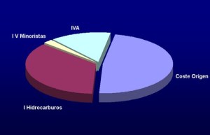 El Estado ingresa dinero por cada litro de gasolina que usted le pone al coche, en concepto de impuestos (a no ser que sea usted de los que ponen pies en polvorosa sin pasar por caja). ¿Cuánto? Pues aproximadamente la mitad (a no ser que viva en Canarias, que entonces tiene menos impuestos). Según dicen aquí, el Estado recauda, anualmente, unos 16.600 millones de € en concepto de impuestos de gasolina y gasoil. En esta otra, hablan de 9.800 millones en 6 meses, o sea, 19.600 millones anuales.