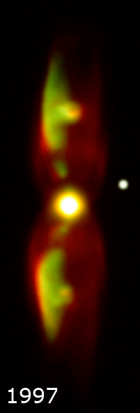 Si se fijan en la imagen animada al comienzo de esta entrada, verán que algo se mueve, año tras año, sobre la superficie de esta impresionante nebulosa. Gracias a este conjunto de observaciones, hemos podido medir el periodo de este extraño faro, que da una vuelta cada 90 años. Además, hemos concluido que lo más probable es que haya una segunda estrella en el núcleo de esta nebulosa, y el faro consista de un chorro de partículas o jet que se origina en la enana blanca, alimentado por el material que «roba» —gracias a su tirón gravitatorio— de la superficie de su compañera, que sería una gigante roja. Estos chorros, eyectados a toda mecha en las direcciones polares, se ven curvados hacia afuera por el viento de la gigante roja, que también tiene algo que decir en este drama. Y todo el sistema, estrellas y faro, dan una vuelta entera cada 90 años. (En rigor habría que decir que no se trata de una nebulosa planetaria, sino una clase parecida de objetos llamados nebulosas simbióticas, pero no les quiero aburrir o confundir con demasiadas sutilezas.)
