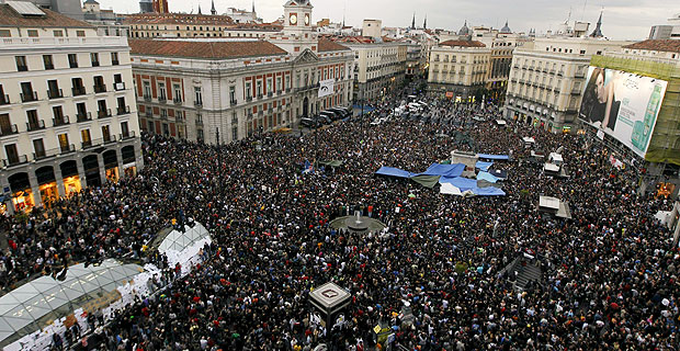 Concentración de ayer, 18 de mayo, en la Puerta del Sol. Visto en latercera.com. Clic en la imagen para verla a tamaño completo.