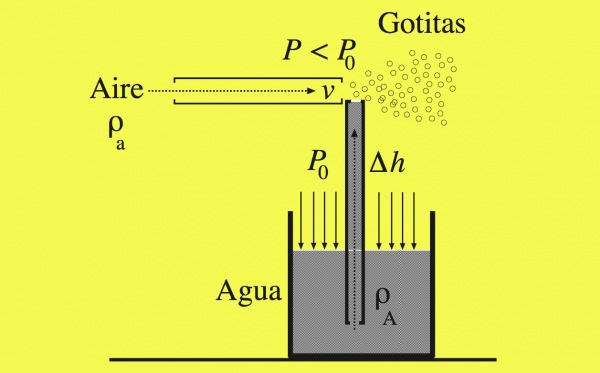 Dicho así puede resultar árido y sin aplicación práctica, pero nada más lejos de la realidad. Fíjense en la imagen que acompaña estas líneas: al soplar por el tubo horizontal, hay un aumento de velocidad del aire en el extremo del tubo vertical, lo que provoca que la presión disminuya. El otro extremo del tubo vertical, en cambio, está sometido a la presión atmosférica que actúa sobre el líquido —agua con pintura disuelta—, que al ser mayor, empuja el líquido hacia arriba por el tubo. Cuando el líquido llega arriba, se encuentra con el flujo de aire a gran velocidad, y es eyectado —pulverizado— hacia delante.