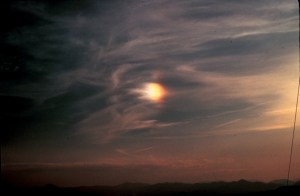 No es el Sol; éste está más allá del borde derecho de la fotografía. Se trata de un parhelio provocado por los cristales de hielo sobre las nubes. Casi nada (crédito Wikipedia)