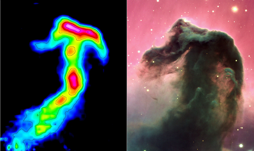 La famosa nebulosa de la cabeza de caballo (a la derecha en luz visible, a la izquierda en radio, a 1 milímetro), es una nube de polvo y gas en el interior de la cual se forman estrellas. La imagen en radio es más fea, de acuerdo, pero nos da más información de lo que ocurre en el interior de la nube.