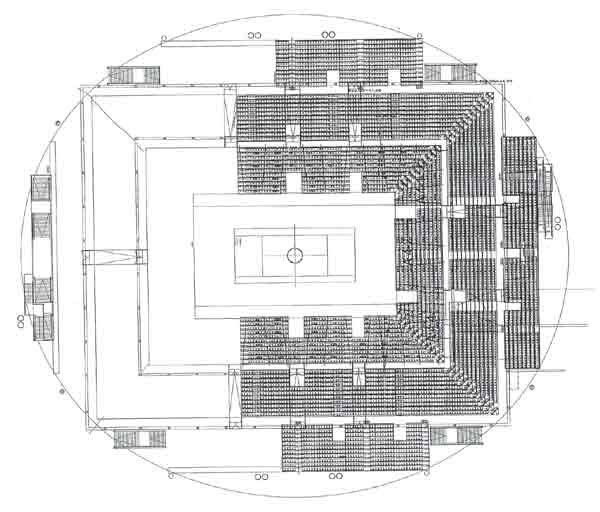 La respuestas es que, como siempre, no hace falta fiarse de nadie. Podemos llegar nosotros mismos a estimar si se sobrepasó el aforo o no. ¿Cómo? ¿Recuerdan lo fácil que era estimar el número de personas en una manifestación? Pues aquí será igual de sencillo, aplicaremos la misma técnica. Tan sólo nos harán falta un puñado de fotografías del festival para estimar la densidad de gente y un plano adecuado del recinto —dotado en este caso de gradas retráctiles para acomodar diferentes tipos de eventos— para calcular la superficie.