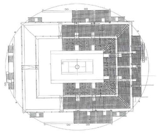 - Se utilizó una configuración en la que todas las gradas del recinto estaban retraídas (pista central + primer piso + segundo piso). Como en el plano de más abajo, pero con las gradas del primer y segundo piso también retraídas. Además, supondremos que los planos del recinto en la página web se corresponden, en cuanto a área, con la realidad.