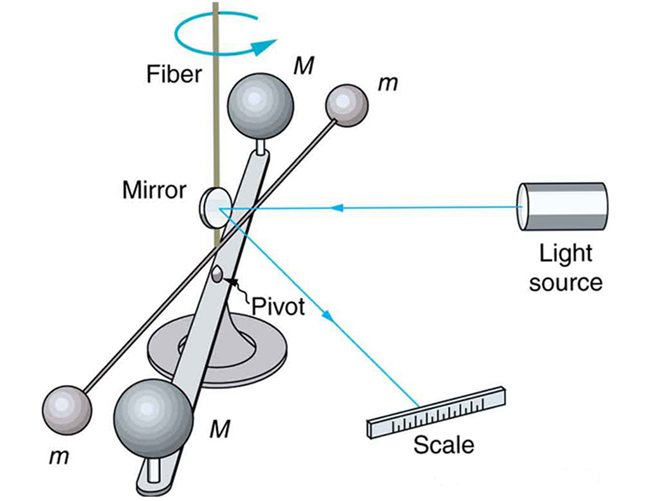 ¿Cómo funciona esta balanza? Muy sencillo: visualicen una vara muy larga, de 180 centímetros, suspendida horizontalmente de un hilo que pasa por su centro. En cada extremo de la vara se cuelga una pequeña esfera de plomo de masa conocida (730 g), de forma que la vara entera está en equilibrio, suspendida sobre el suelo. A su alrededor construimos una jaula de vidrio para aislar la vara de perturbaciones molestas como corrientes de aire, etc. Ahora, imaginen que situamos una esfera de plomo, mucho mayor (158 kg), a tan solo 23 centímetros de una de las esferas pequeñas, y otra igual de grande a la misma distancia de la otra esfera pequeña, pero en el lado opuesto de la jaula de vidrio. Pues bien, cada esfera grande atraerá a su homóloga pequeña cercana por atracción gravitatoria, de manera que la vara entera se desviará —realizará un movimiento de torsión alrededor del hilo del que está suspendida— de su posición original un ángulo muy, muy pequeño, pero medible.
