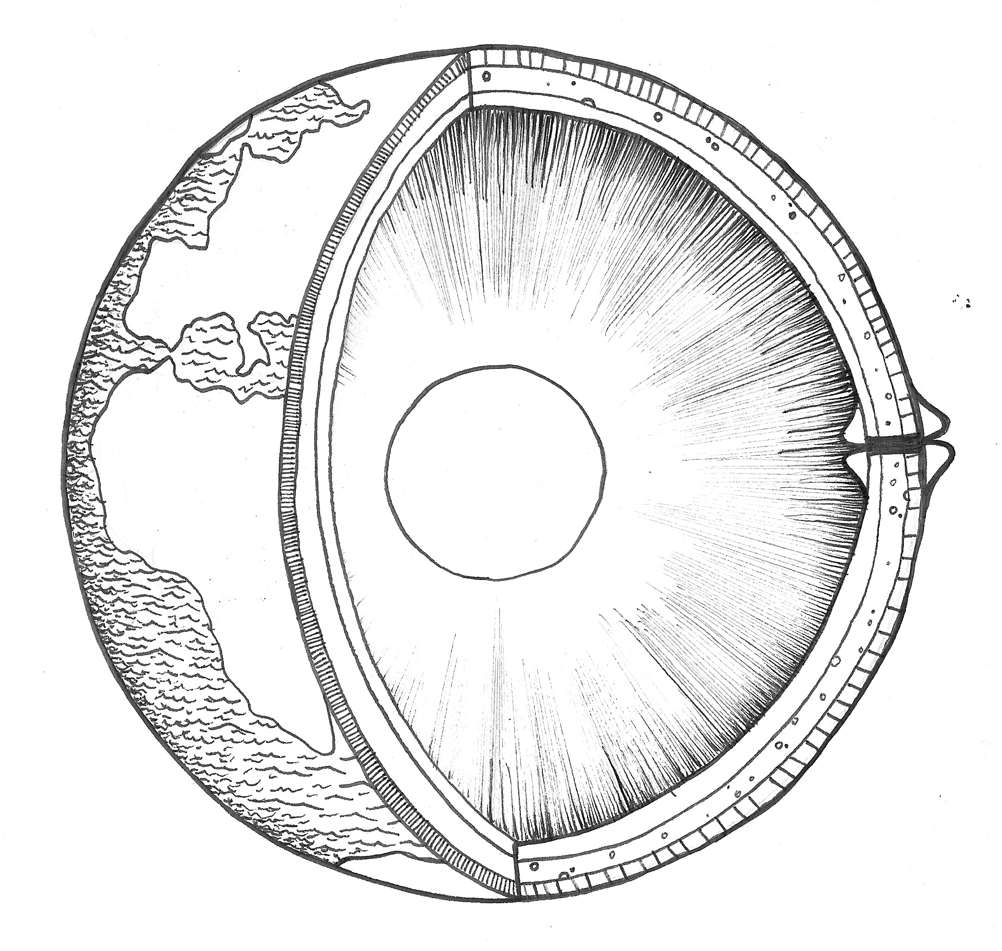 Pero eso no es lo peor (bueno, para ellos sí). Imagine la situación. Un núcleo de hierro esférico en el centro, rodeado por aire —o vacío, casi mejor— y una corteza enorme, de 6300 km de radio y 12 km de espesor, sobre la cual vivimos nosotros, felices en nuestra ingenua creencia de que la Tierra es una esfera de roca. ¿Por qué no cae la corteza sobre el núcleo? Pues porque está perfectamente centrada sobre él, de forma que la gravedad que actúa sobre un lado se compensa perfectamente con el otro, que está exactamente a la misma distancia.