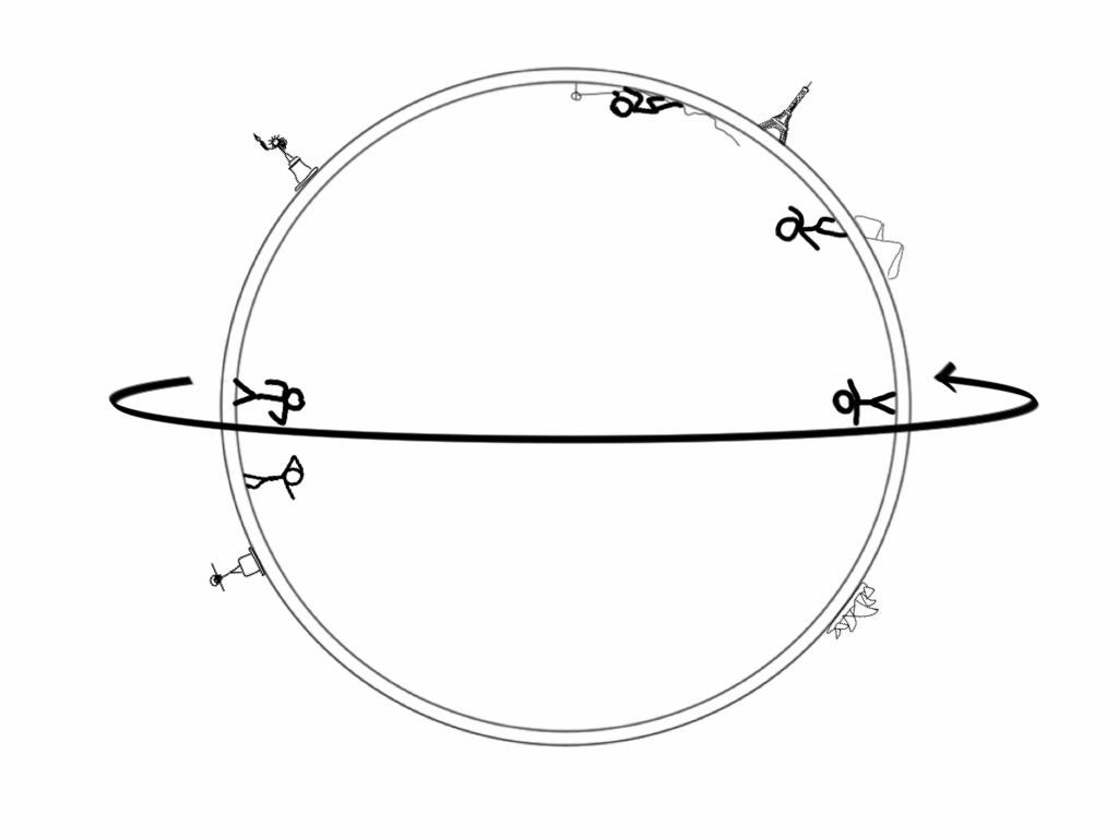 Y no solo eso. Vivir en el interior de la esfera —asumiendo que uno puede internarse cual profesor Lindenbrock y compañía en Viaje al centro de la Tierra— no sería todo lo cómodo que uno esperaría: resulta que en el interior de una corteza esférica, el campo gravitatorio se anula. Esto se debe a lo que se conoce como el teorema de Gauss, que, expresado de forma muy rudimentaria, viene a decir que el tirón del trozo de corteza que tienes bajo tus pies se compensa con el de todos los trozos que tienes, más lejos, sobre tu cabeza. Así, lo único que te pegaría a la pared interior de la corteza, haciendo las veces de ‘gravedad’, sería la fuerza centrífuga del planeta al girar sobre su eje. Una gravedad que sería máxima —300 veces más débil que la gravedad que experimentamos cotidianamente, ya ven qué «máxima»— en la cara interior del ecuador, y que iría disminuyendo de forma progresiva hacia los polos, al mismo tiempo que aumenta la ‘pendiente’ del paisaje, hasta hacerse completamente vertical.