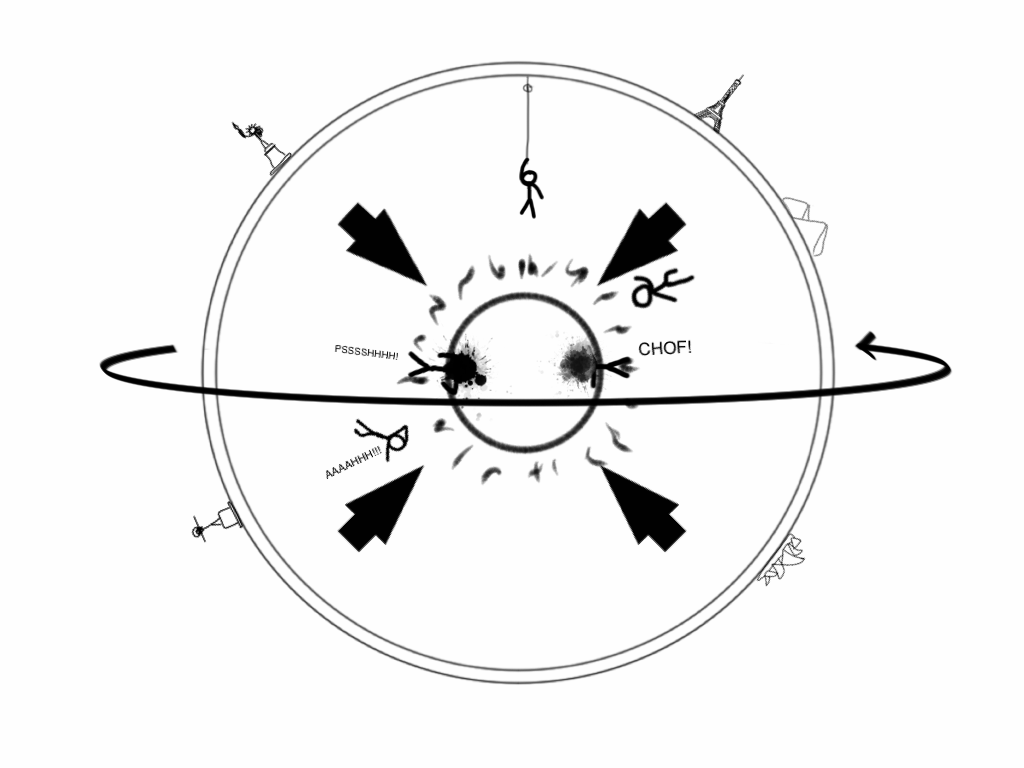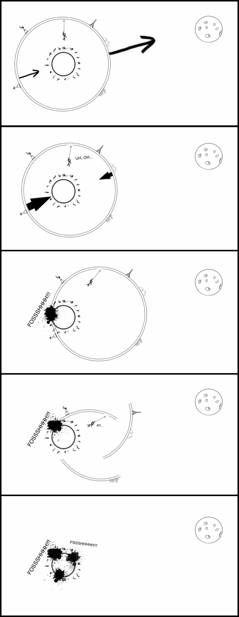 Ahora, olvídese de la civilización interior. Si ya antes se tiraban meses yendo a recoger por la dichosa pelota de fútbol cada vez que alguien la sacaba del campo, ahora su situación es peor: el núcleo de hierro sobre sus cabezas, un inmenso océano de hierro fundido, tiraría de ellos con mucha más fuerza que la que les pega al suelo por la débil fuerza centrífuga. Caerían cual Gollum al magma del Monte del Destino. ¡Chof! Pssssssshhhhh…